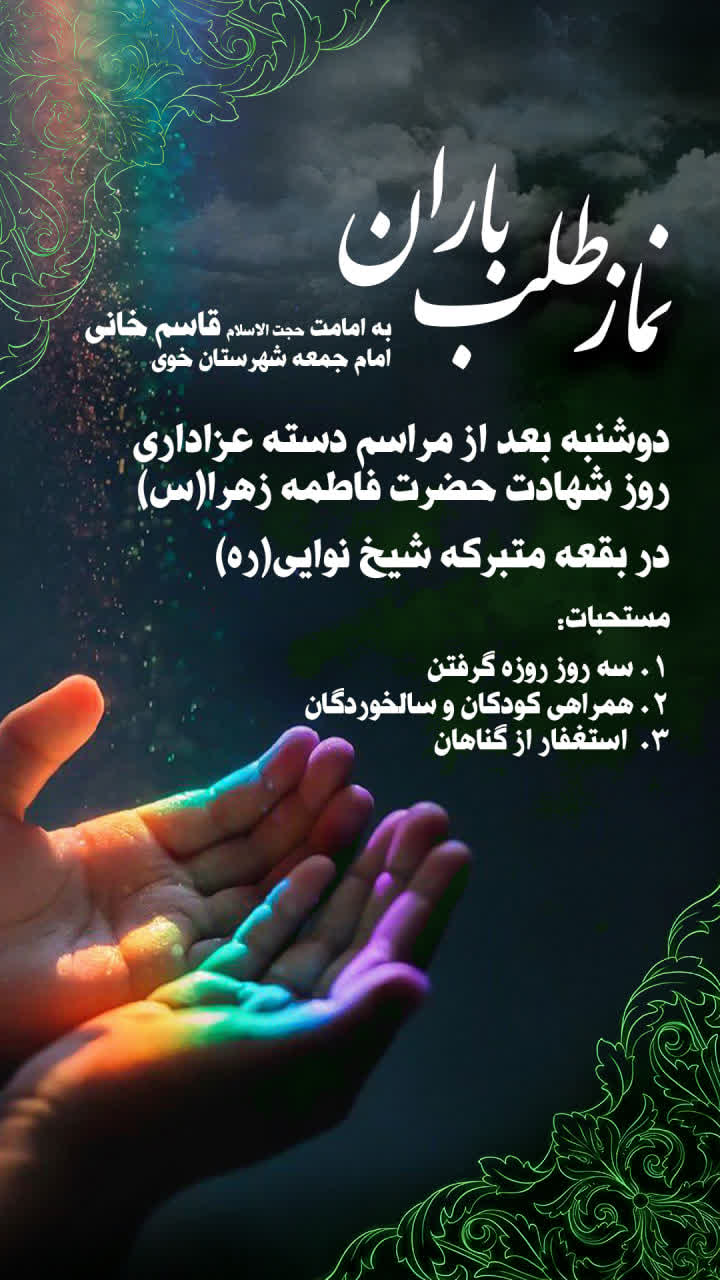 🔰نماز طلب باران به امامت حجت الاسلام والمسلمین قاسم خانی "امام جمعه شهرستان خوی " 🗓دوشنبه بعد از مراسم دسته عزاداری روز شهادت حضرت فاطمه الزهرا (س) در بقعه متبرکه شیخ نوایی(ره)