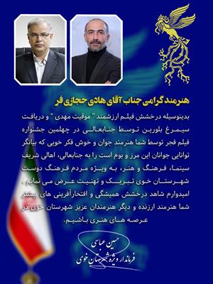 پیام تبریک فرماندار ویژه شهرستان خوی به مناسبت درخشش هادی حجازی فر هنرمند اهل شهرستان خوی در جشنواره فیلم فجر