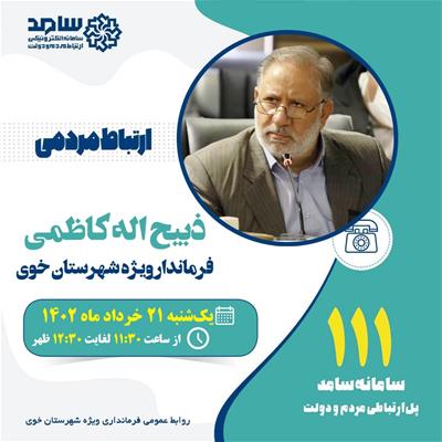 فرماندار ویژه شهرستان خوی روز یکشنبه مورخ 21خرداد در سامانه تلفنی 111 سامد حضور خواهد یافت.