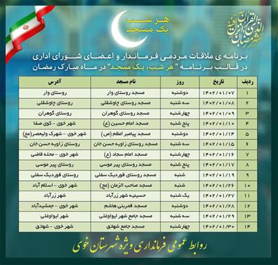 به منظور بررسی مسایل و مشکلات مردم و دیدار مسئولین با مردم برنامه هرشب یک مسجد در ماه مبارک رمضان برگزار می گردد.