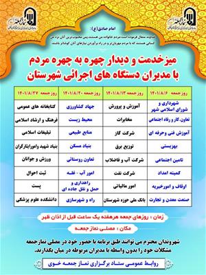 اطلاعیه میز ارتباطات مردمی در محل مصلی امام خمینی (ره) خوی در آبان ماه از ساعت 11 ظهر- قبل از خطبه های نمازجمعه برگزار می شود.