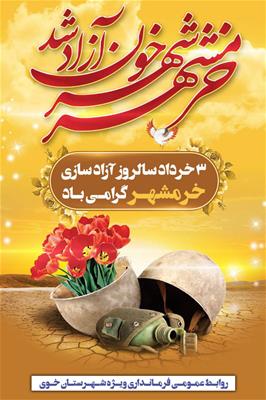 سوم خرداد سالروز فتح خرمشهر قهرمان در عملیات بیتالمقدس نماد و مظهر شجاعت وجانفشانیهای دلیرمردان و شیرزنان غرورآفرینی که به مدد الهی و با سلاح ایمان در دفاع از انقلاب، آرمانهای امام راحل (ره) و نظام مقدس جمهوری اسلامی جهادگرانه تا پای جان رفتند.