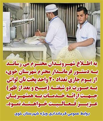 به اطلاع شهروندان محترم می رساند به دستور فرماندار محترم شهرستان خوی، از یوم جاری تعداد 20 واحد پخت نان لواش، همه روزه بصورت دو شیفته (صبح و بعد از ظهر) فعالیت خواهند نمود.