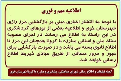 در اجرای مصوبه ستاد ملی و استانی مبارزه با کرونا همچنان مرز رازی تا اطلاع ثانوی بسته می باشد- دوشنبه 29 شهریور 1400 ساعت 13:59