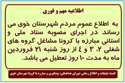 تعطیلی مشاغل گروه های 2، 3 و 4 در شهرستان خوی از 21 فروردین به مدت 10 روز
