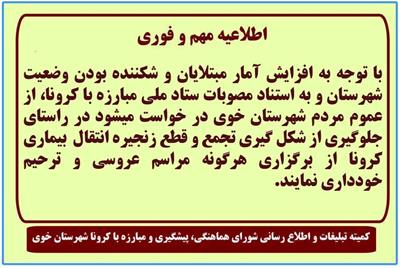 فرماندار ویژه شهرستان خوی: مردم با توجه به وضعیت شکننده شهرستان دستورالعمل های بهداشتی را رعایت نمایند/954 نفر با اولویت های تعیین شده وزارت بهداشت و درمان در سطح شهرستان واکسن کووید 19 را دریافت کرده اند/ دورهمی و تجمع در بوستان ها و فضای سبز در روز طبیعت ممنوع است- سه شنبه 10 فروردین 1400 ساعت 08:54