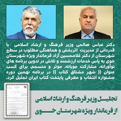 دکتر عباس صالحی وزیر فرهنگ و ارشاد اسلامی با قدردانی از مدیریت اثربخش و هماهنگی مطلوب در سطح شهرستان از دکتر غلامحسین آزاد فرماندار ویژه شهرستان خوی به پاس خدمات ارزشمند و تلاش در تدوین برنامه های نوآورانه، مشارکت جویانه، موثر و منسجم، برای کسب عنوان (( شهر مشتاق کتاب )) در برنامه نهمین دوره جشنواره انتخاب و معرفی پایتخت کتاب ایران تجلیل کرد.