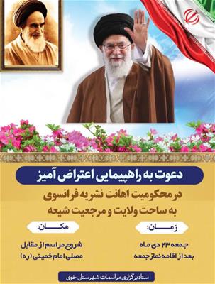 در پی اهانت نشریه فرانسوی به مرجعیت شیعه ؛ از مردم همیشه در صحنه شهرستان خوی برای شرکت در این راهپیمایی دعوت می شود.