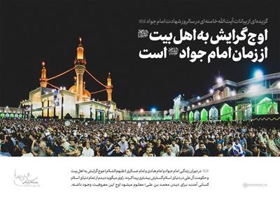 آیتالله خامنهای: در دوران زندگی امام جواد و امام هادی و امام عسکری (علیهم السّلام) موجب گرایش به اهل بیت و حکومت آل علی در دنیای اسلام و گسترش بیشتری پیدا کرده. راوی میگوید دیدم از تمام دنیای اسلام کسانی آمدند برای دیدن محمد بن علی؛ معلوم میشود اوج این معروفیت وجود داشته. 64/5/26
