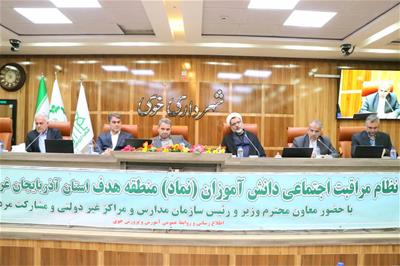این جلسه با حضور معاون وزیر و رئیس سازمان مدارس و مراکز غیر دولتی وزارت، سرپرست آموزش و پرورش استان،فرماندار، نماینده مردم در مجلس شورای اسلامی، سرپرست آموزش و پرورش خوی و مدیران و نمایندگان دستگاه های عضو ائتلاف نماد و مدیران مدارس هدف در محل سالن شهید برگزینی شهرداری برگزار شد.